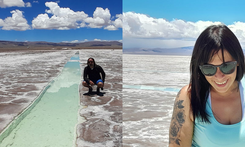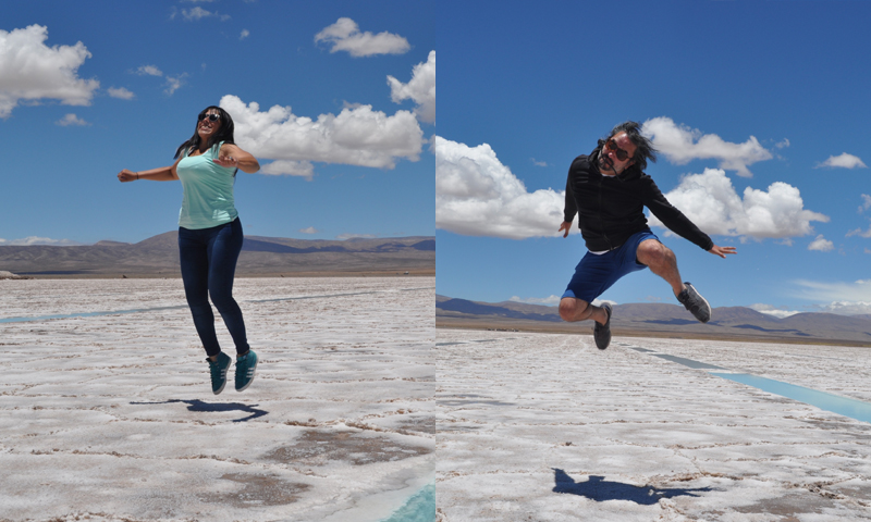 Ya falta menos, apenas unos minutos y se empieza vislumbrar la blancura teñida de marrón, una planicie y en un cerrar y abrir de ojos desaparece. Seguimos ruta y si ahí está la Salina en la combinación justa entre un cielo celeste pleno salpicado por espuma blanca y esa superficie craquelada entre el blanco de la sal y la tierra craquelada luego de lluvias que duraron una semana. Lo que no sucedía muy a menudo este verano sucedió.